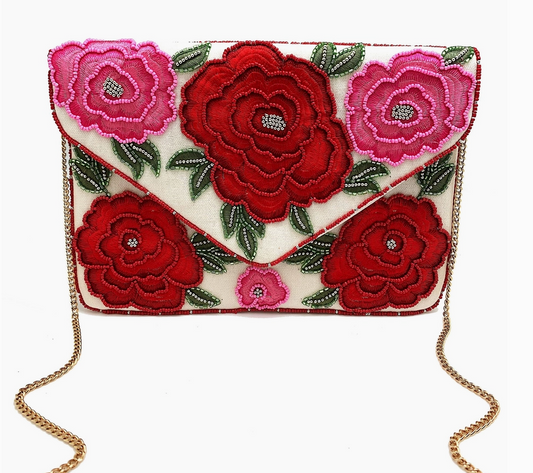Embroidered and Beaded Rose Envelope Clutch