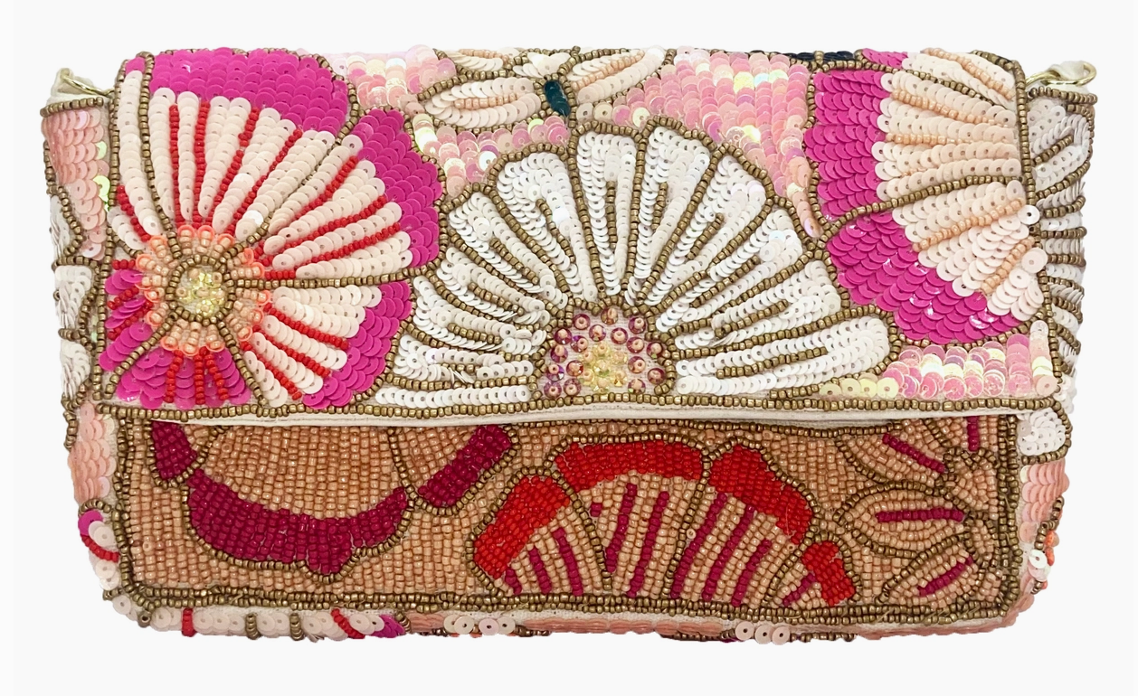 Blooming Flower Beaded Clutch Elevate your accessory collection with our stunning “Floral Garden Bloom” Beaded Clutch. Measuring 9 inches in length and 6 inches in height, this elegant clutch is a perfect blend of style and functionality. Handcrafted with meticulous care, each clutch is made in India using 100% premium cotton for the interior and backing, ensuring durability and a soft touch. The intricate beading showcases a vibrant floral garden design, making it a captivating statement piece for any occasion. The clutch features a secure magnetic snap button closure and comes with a crossbody chain, offering versatility in how you carry it. Inside, you’ll find one interior pocket, perfect for organizing your essentials. Whether you’re dressing up for a special event or adding a pop of color to your everyday ensemble, this beaded clutch is a must-have accessory. It’s perfect for gifting or enhancing your personal collection.