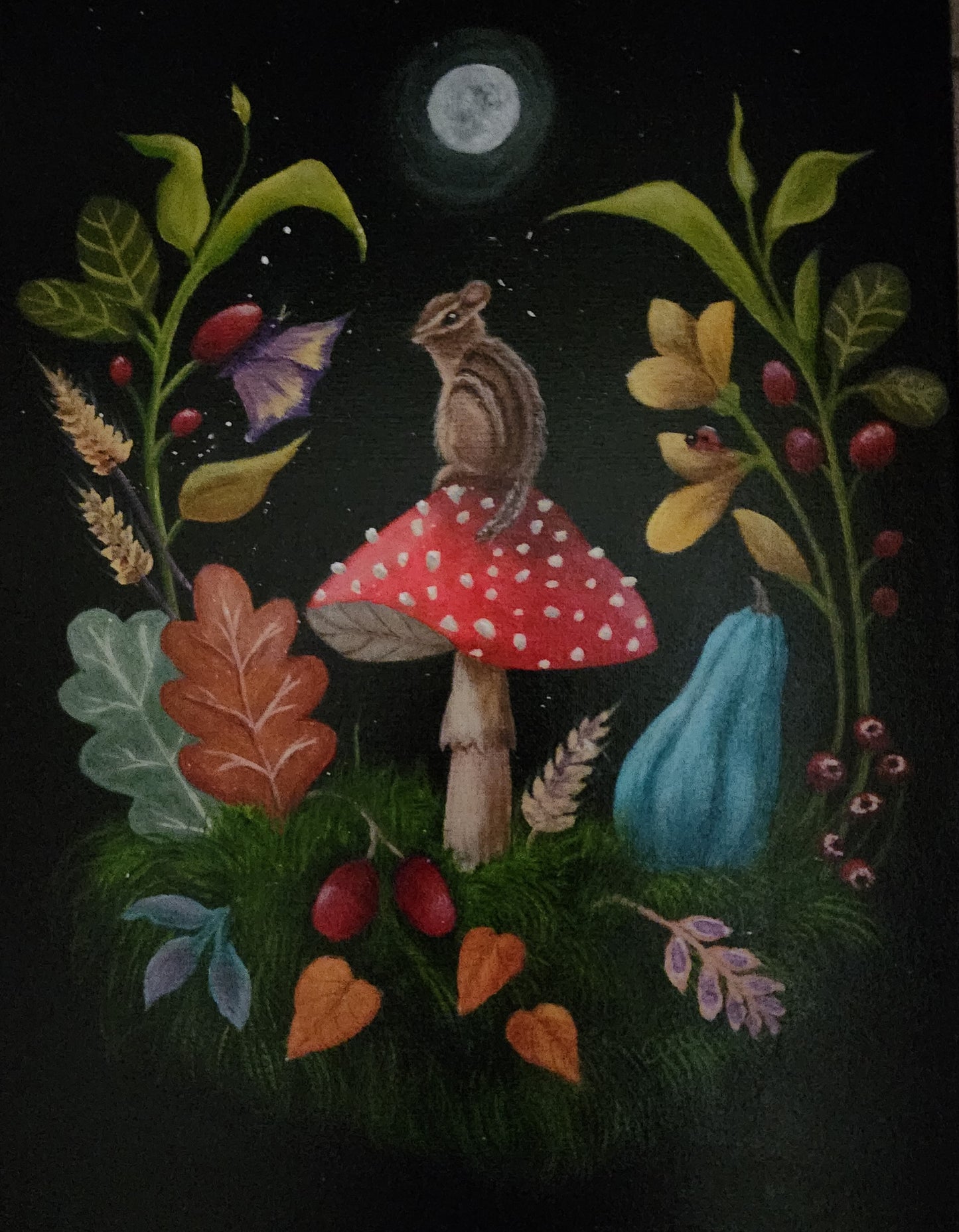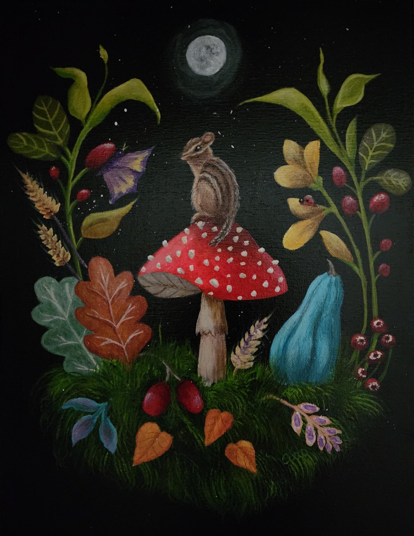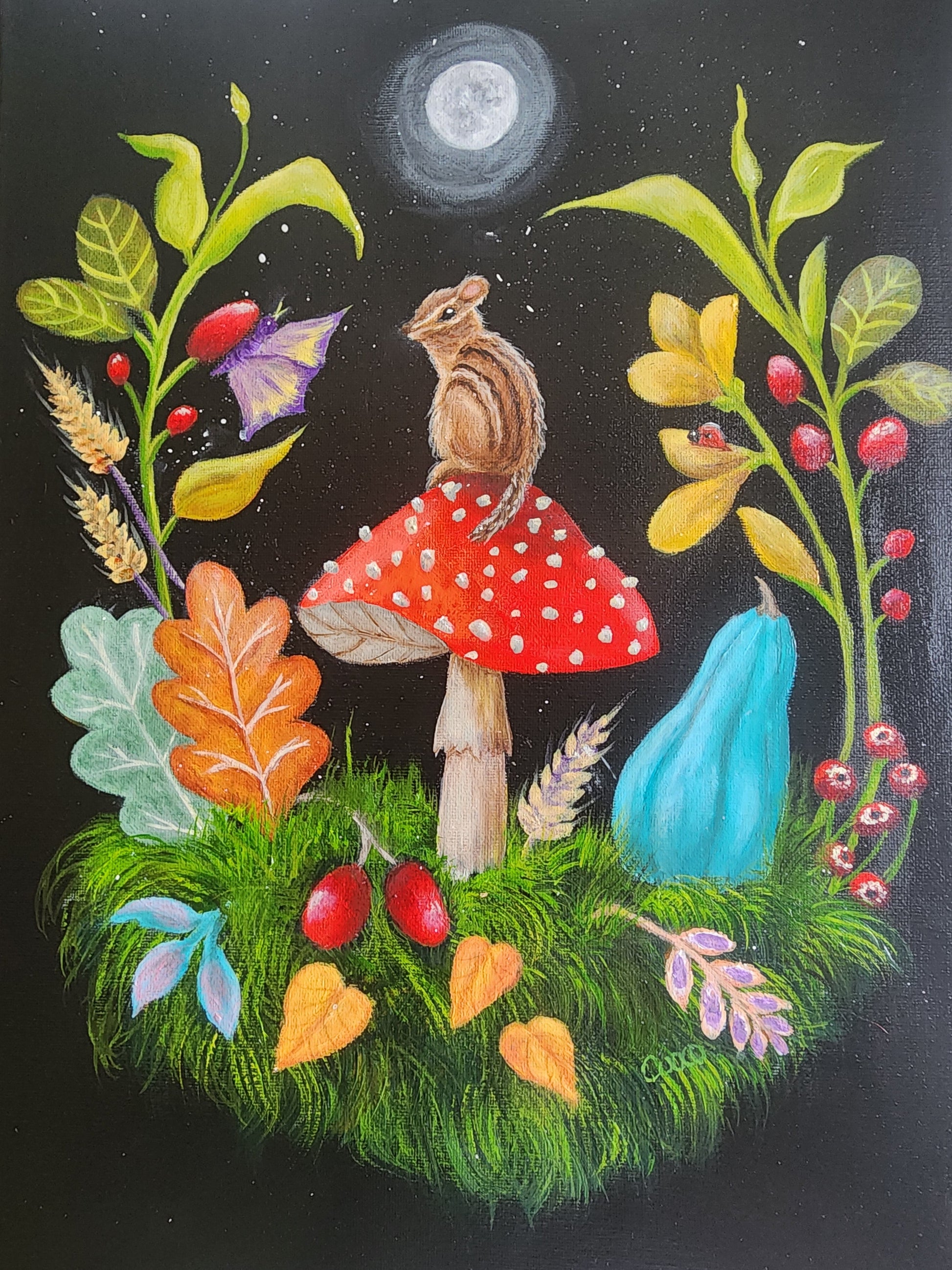 Measuring 12 x 16, this playful and imaginative acrylic painting combines acrylic and neon gouache on a black canvas. The neon colors inject a vivid and energetic flair to the rich pigments, making it a striking and visually captivating artwork.