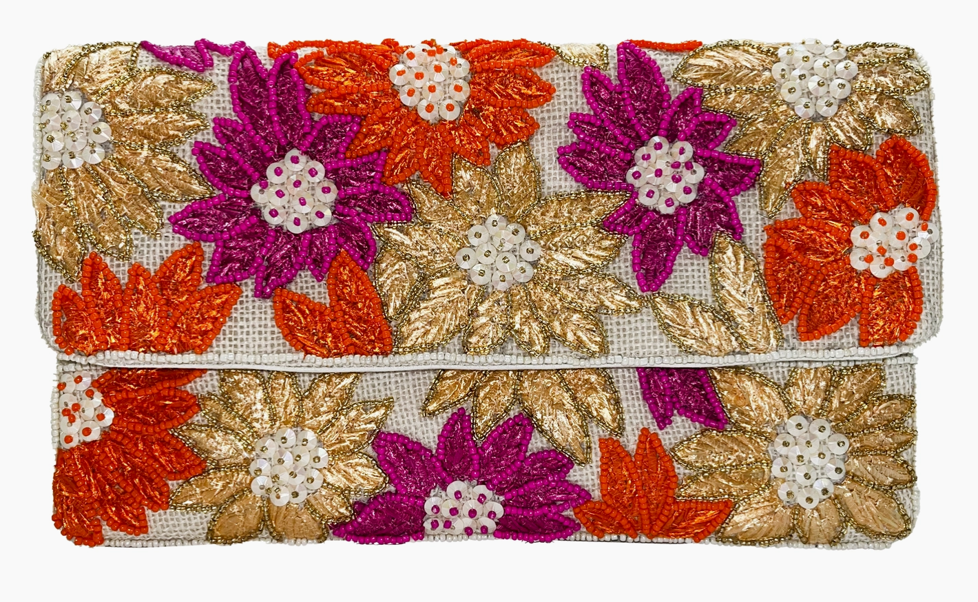 This gorgeous Dancing Flowers Raffia Beaded Clutch handbag is crafted with raffia which is a natural fiber. It features 100% cotton lining and backing for durability and a soft feel. It showcases vibrant flowers with intricate embroidery and vibrant beading. It has a magnetic snap button closure and a cross body chain.