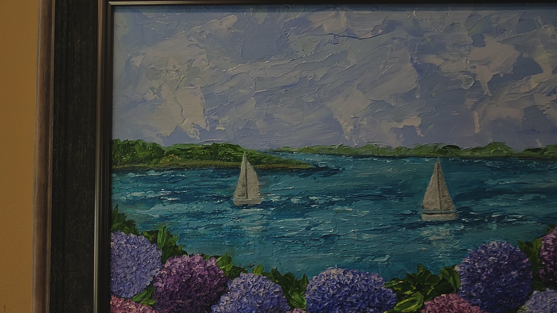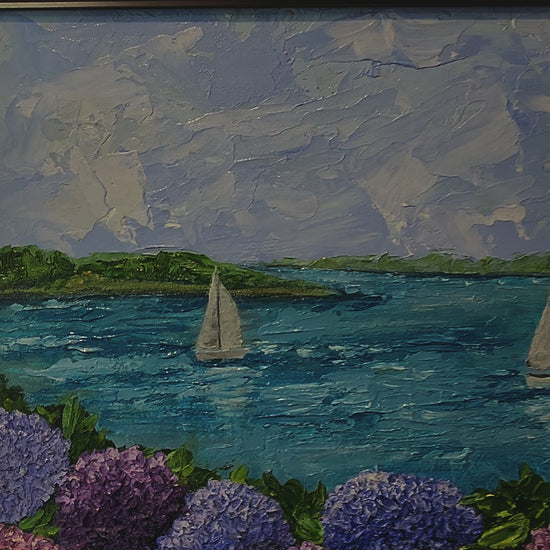 Dive into the vibrant world of Ocean Hydrangeas, an impasto pallet knife acrylic masterpiece bursting with lively colors that practically leap from the canvas. It’s like standing amidst the blooms, watching sailboats drift across sparkling blue waters—pure joy captured in paint