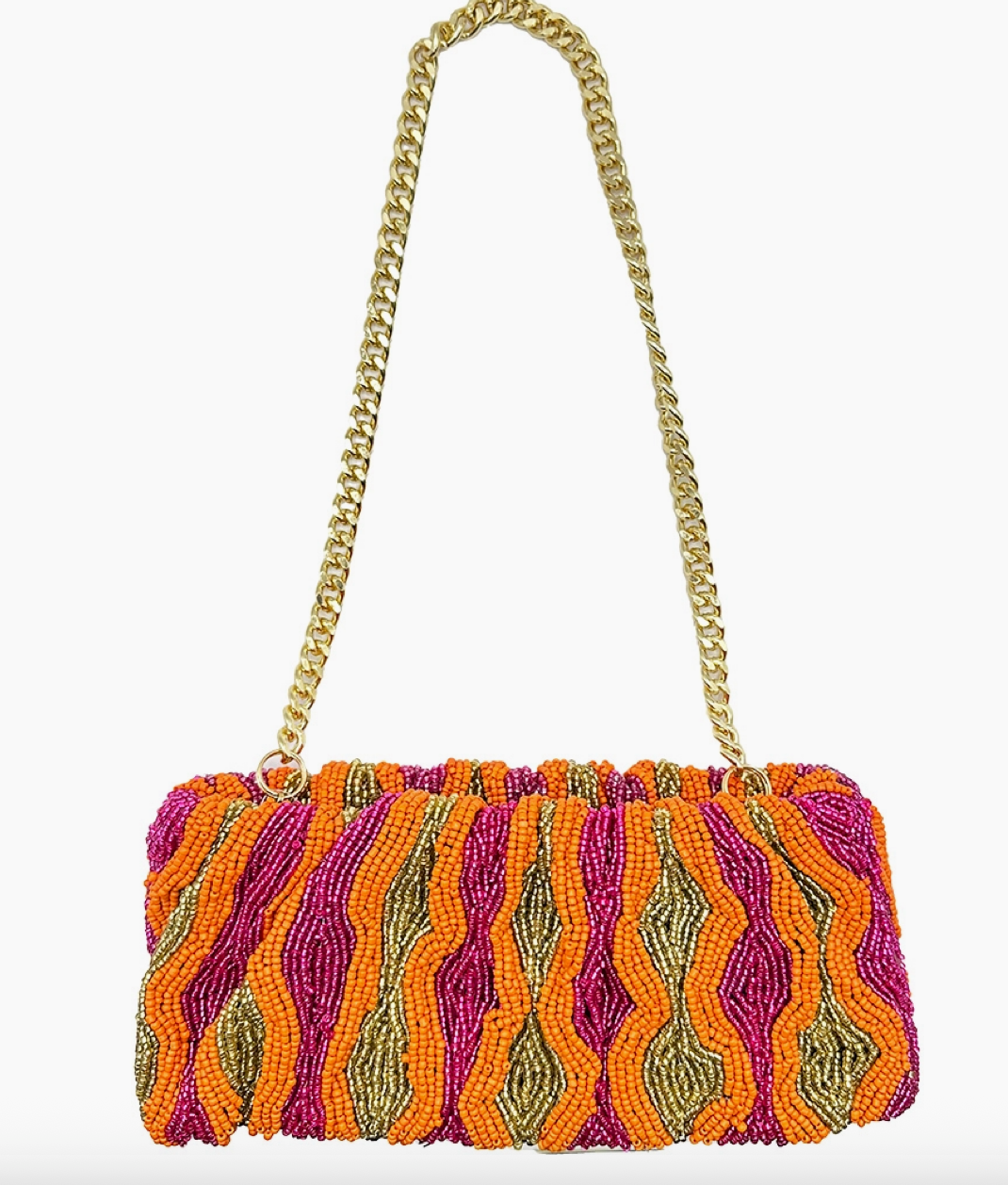 This beaded bag evokes a timeless charm with its elegant and refined style. Measuring about 10 by 5 inches, it features a secure zipper closure. Crafted to be both beautiful and durable, it includes a gold chain, allowing you to carry it as a clutch or wear it over the shoulder. Its vibrant pattern and unique design make it a standout accessory for any occasion.