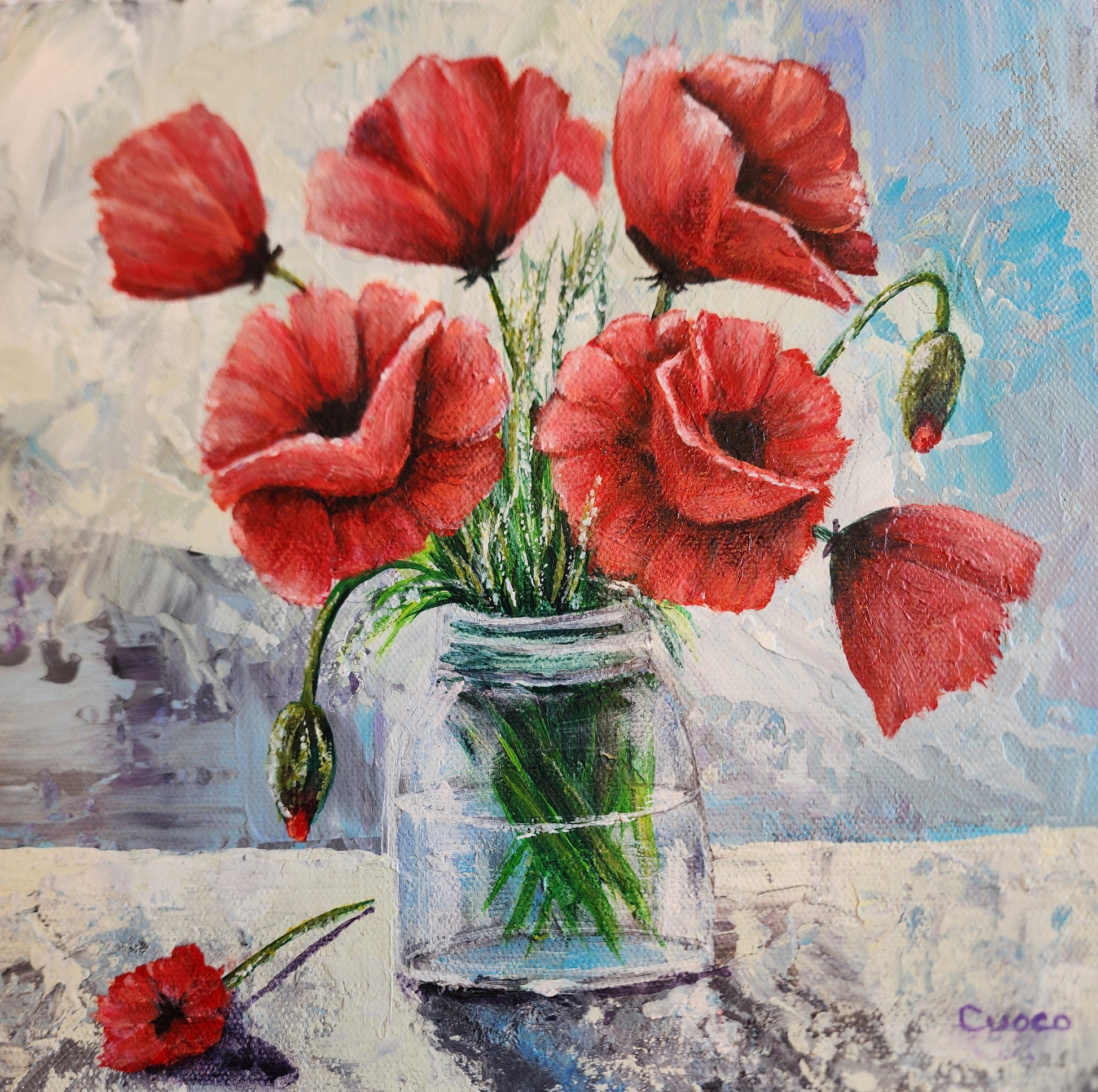Experience the vibrant charm of these Poppies on a 10" x 10" textured acrylic painting, expertly crafted on a high-quality gallery-wrapped canvas. With a 1.5-inch depth, it arrives ready to display—no frame needed—making it the perfect addition to elevate any space effortlessly.