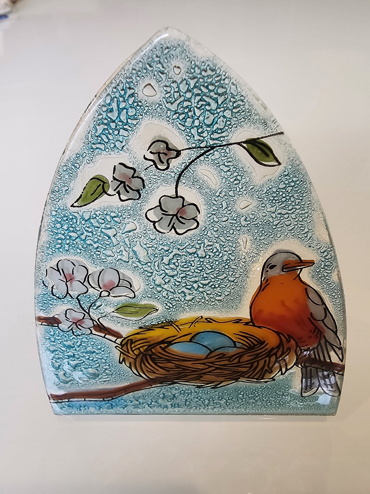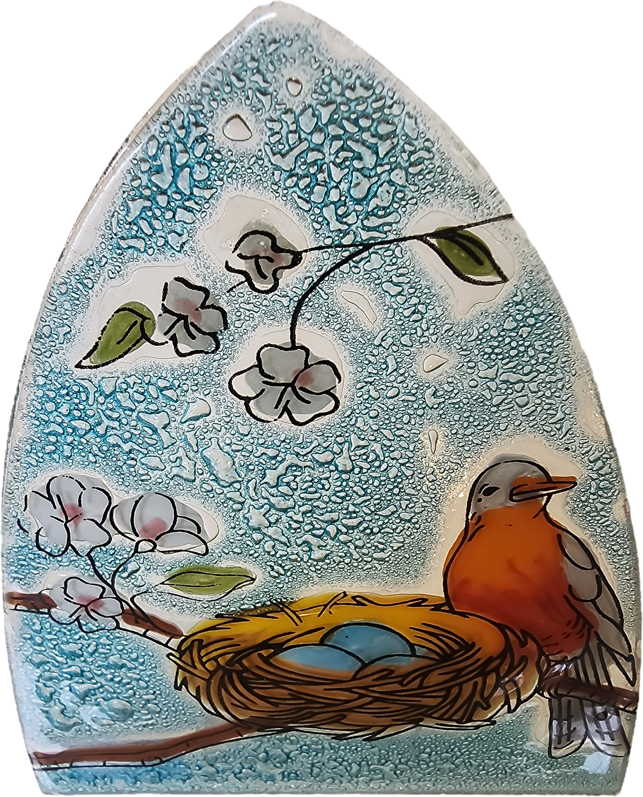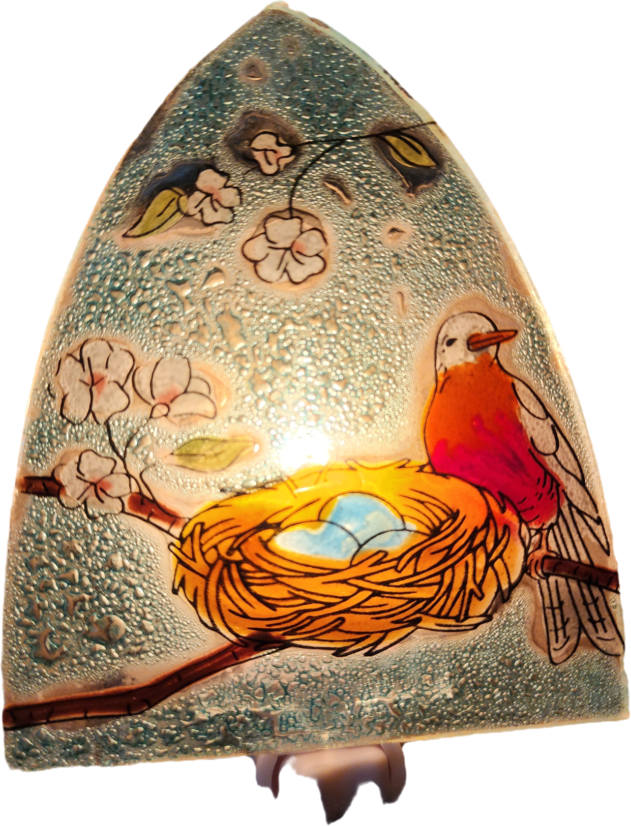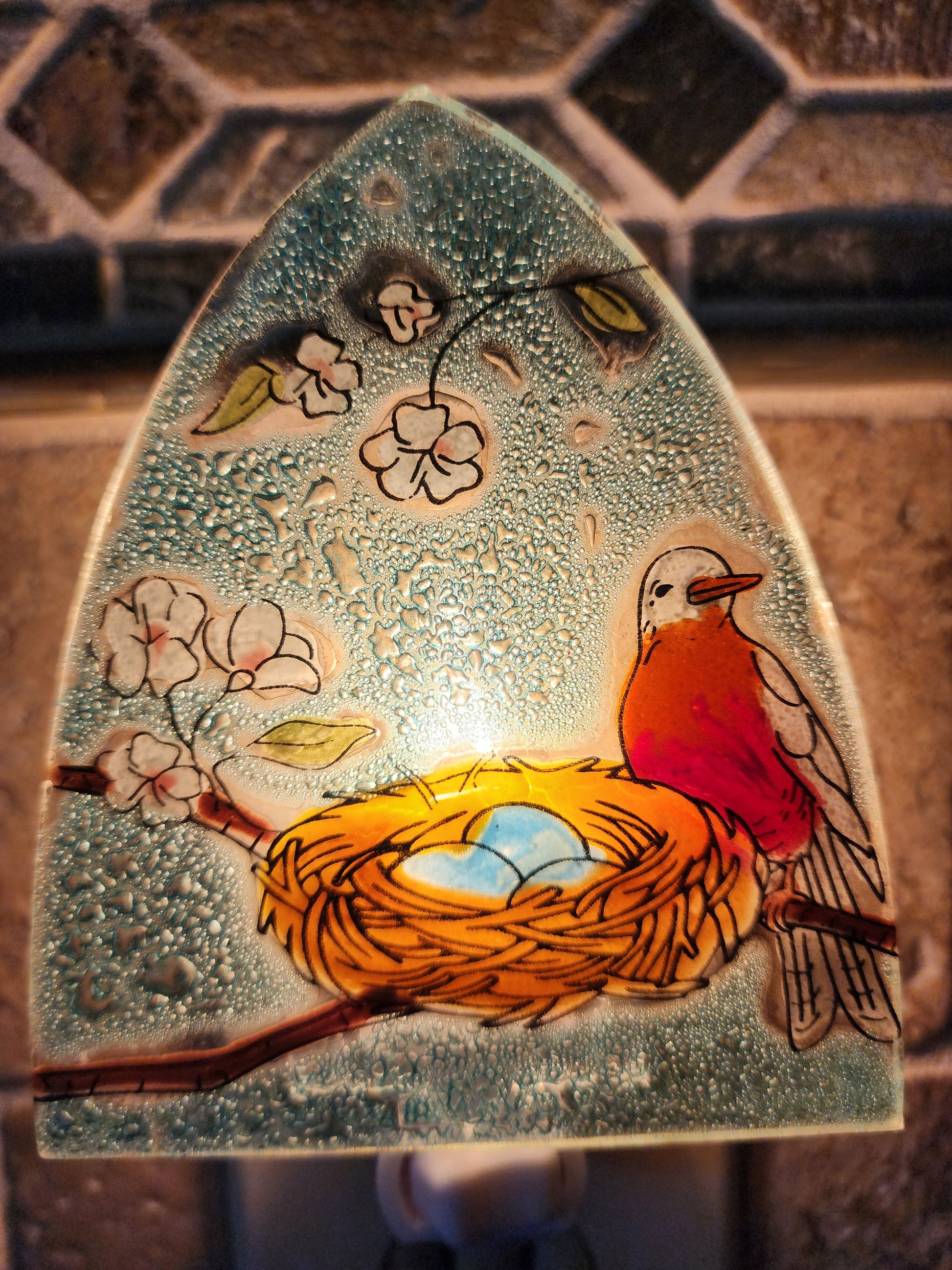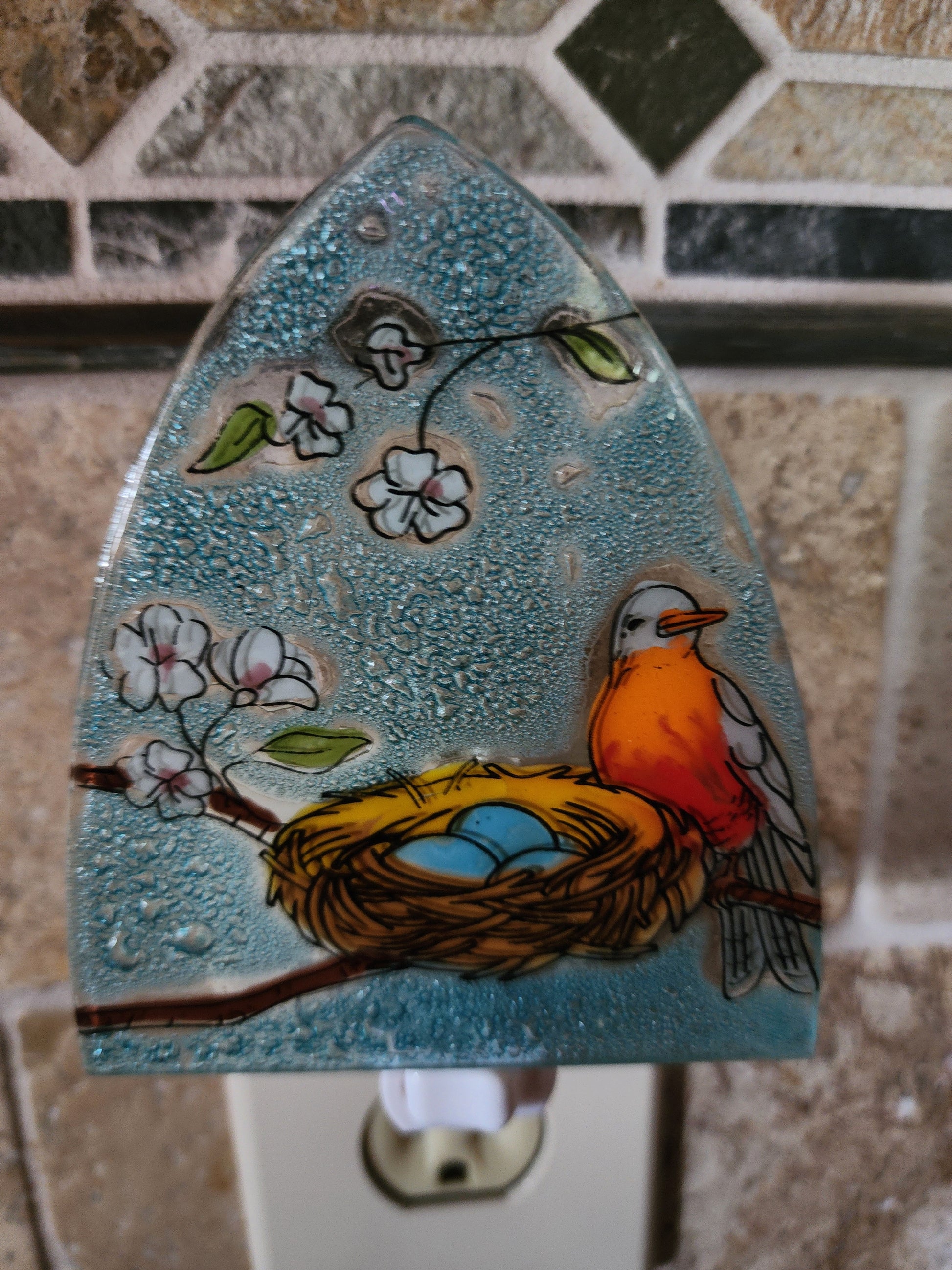 This nightlight showcases a charming Robin Red Breast lovingly watching over her tiny chicks nestled snugly in their warm, secure nest.